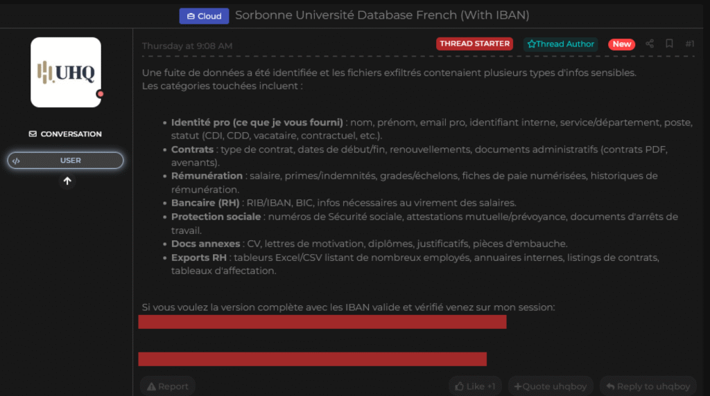 A threat actor on the dark web is disseminating sensitive data allegedly stolen from Sorbonne Université, a prestigious French university located in Paris. The university has 3,000 staff members, 22,000 students, and 2,500 doctoral students.